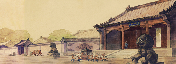 杨占家:设计横店的明清宫苑的时候,就住在北影厂隔壁,可以到故宫拍照片,到图书馆找资料也方便。这个设计工作,带着十来个助手,干了两年多。我们是古建方法画,横店的设计院把图翻成工程图。设计和建造明清宫苑投入很大,建筑都是一比一的,没有缩小,不过只是做了主要场景,次要的不做。故宫很多材料,像汉白玉,成本非常高,明清宫苑都该用水泥,上面喷一些白沙子,看起来有点像。