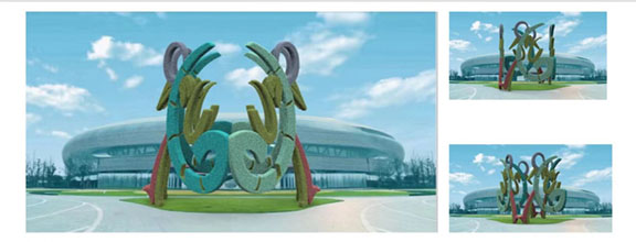 这件作品就像一个在冲向终点的运动员,取得胜利雀跃的奔跑姿势,抽象的奔跑形态与成都典型代表的动物熊猫头部形象有趣的结合在一起,该作品从不同的角度观看有着不同的形态感受,正面呈现出大熊猫的头部形态,侧面观看则是运动员奔跑的形态,共四个单体相连,形成作品整体,寓意着大运会运动员们团结一致,紧密相连。增加人们对体育赛事和文化交流的理解,形成一个非常好的国际交流大舞台。