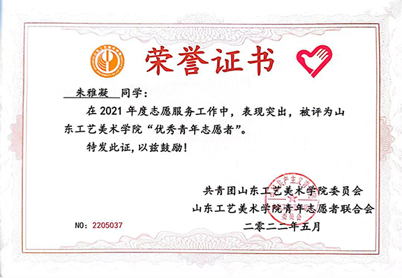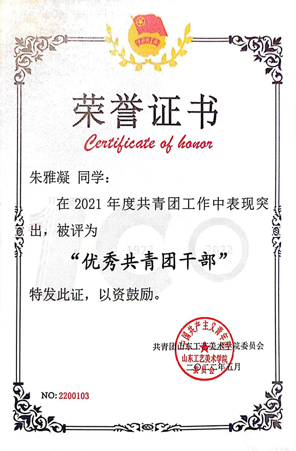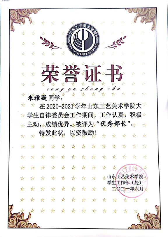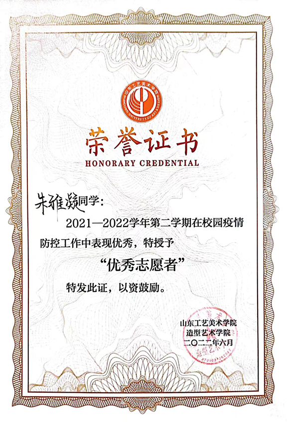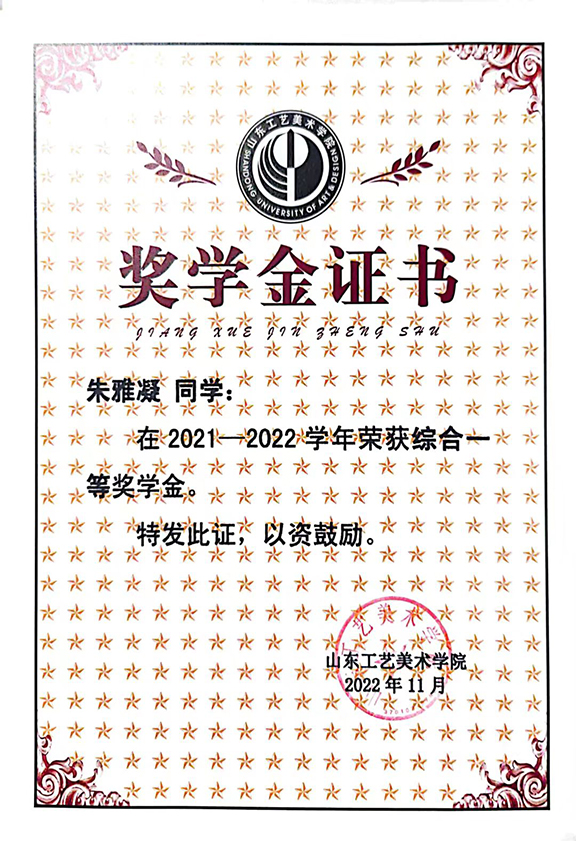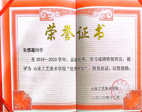 孙长林奖学金是学校专业类领域的最高荣誉,这是在校期间学校对我学习为人的最大肯定。它给予了我极大的信心和鼓励。我也始终会践行初心和使命,秉承天工开物匠心独运的校训继续走下去,争取创作出更好的作品。