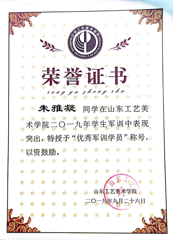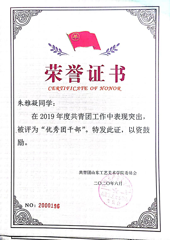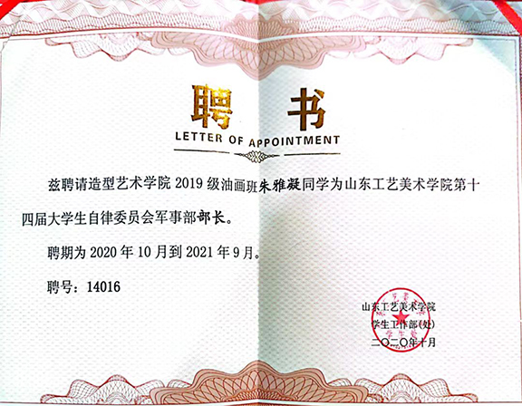 曾任、现任职务:曾任造型艺术学院团总支组织委员、第十四届大学生自律委员会军事部部长,现任造型艺术学院学生党支部组织委员、2019级油画班团支书