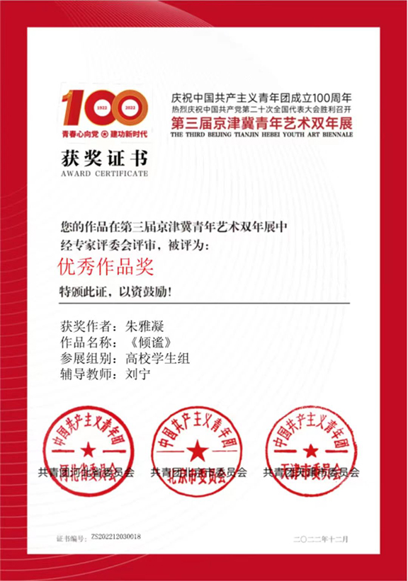 在专业创作方面,我始终秉承着为人民而创作的理念,荣获省部级奖项十余项,入选了山东省美术家协会举办的第二十六届山东省美术新人新作展、山东省文旅厅“讲好山东黄河故事 守护齐鲁文化根脉”展览、上海市教委第四届中国大学生创意节、河北省团委北京市团委天津市团委举办的第三届京津冀青年艺术双年展等省部级比赛,我始终坚信青衿之志,履践致远,只有脚踏实地方能行之更远。