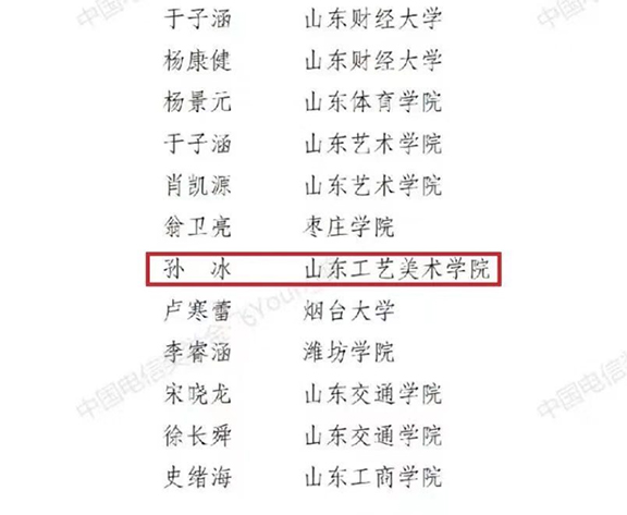 11月8日,2021年度“中国电信奖学金”获得者名单公示,我校来自工业设计学院的孙冰同学在本次奖学金评选中表现优异、脱颖而出,获得“中国电信奖学金·飞Young奖”。
