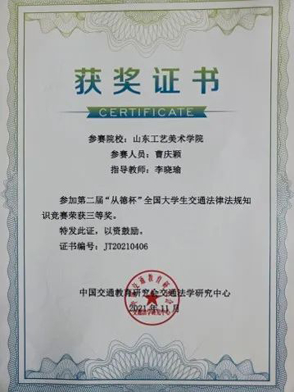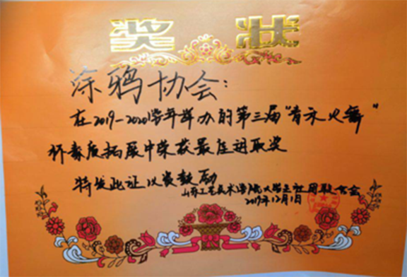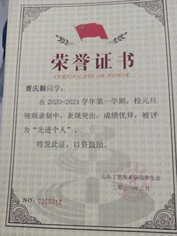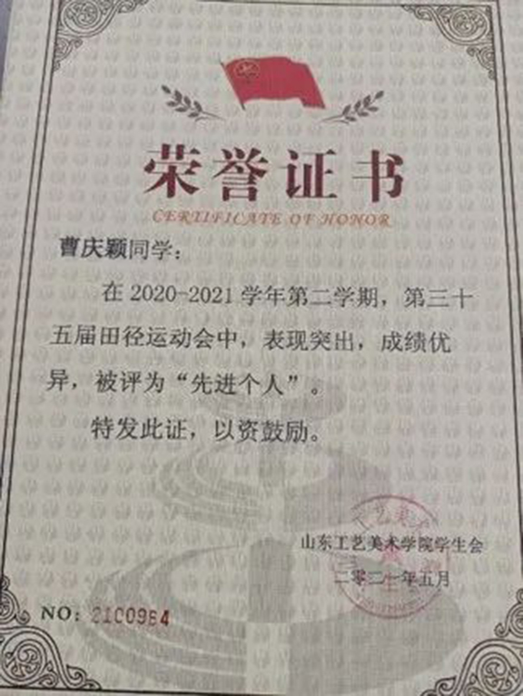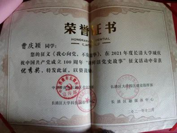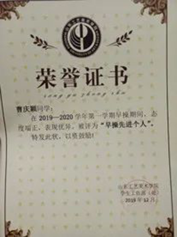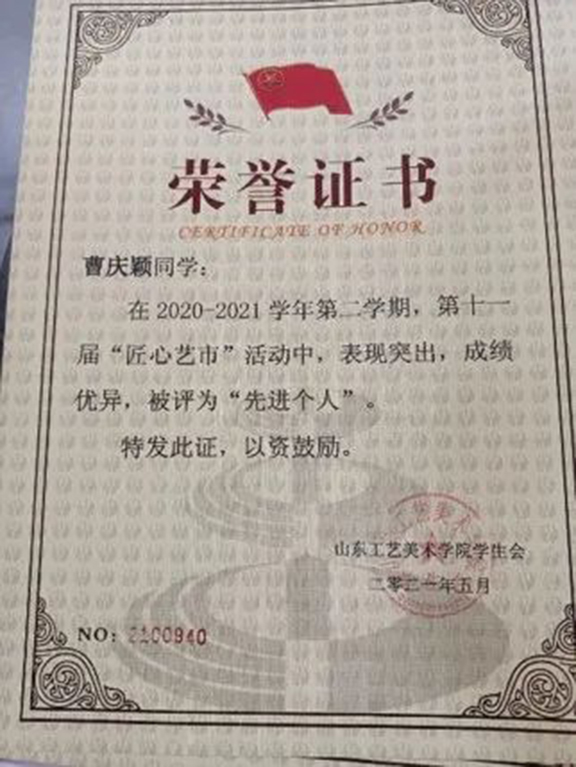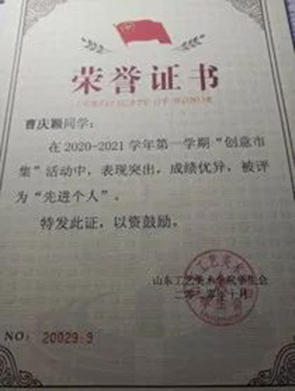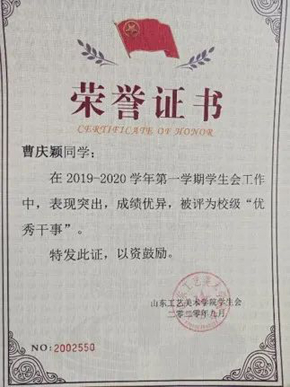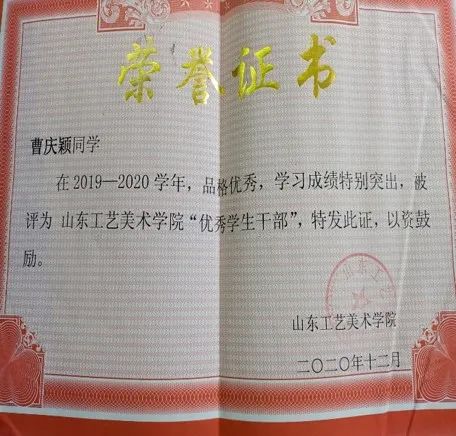 在学习方面,曹庆颖同学也严格要求自己。她努力学习专业知识,2019-2020学年获得“综合二等奖学金”,2020-2021学年获得“综合一等奖学金”。“第二课堂”成绩位列班级第一,获得2025新澳门免费原料大全第二届“二课达人”称号。