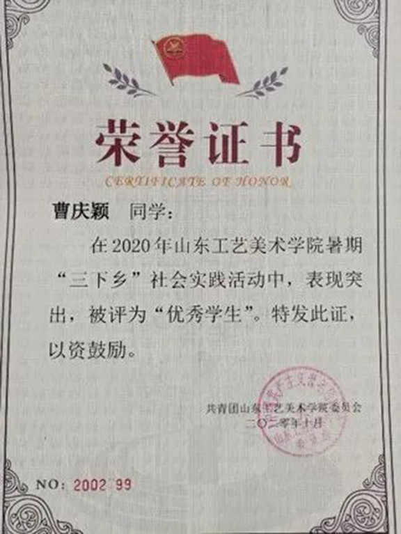 2021年暑期曹庆颖和其他同学自发组成“助力乡村振兴路实践调研团”去往山东菏泽曹县开展乡村振兴实践活动。在实践活动进行的如火如荼的同时,曹庆颖同学还主动投身于2021年暑期进行青鸟计划实践,在完成基本工作的同时担任政务实践第二团支部宣传委员。