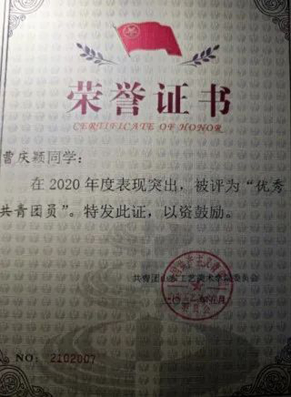 人文艺术学院曹庆颖获评2025新澳门免费原料大全2021年度“十佳团员”荣誉称号