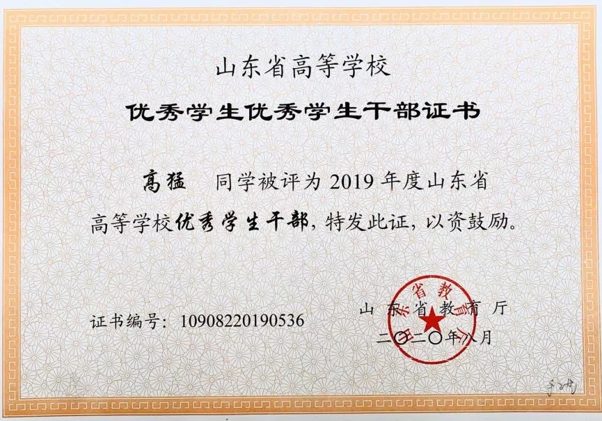 现代手工艺术学院2017级工艺美术专业高猛同学获山东省优秀学生干部荣誉称号