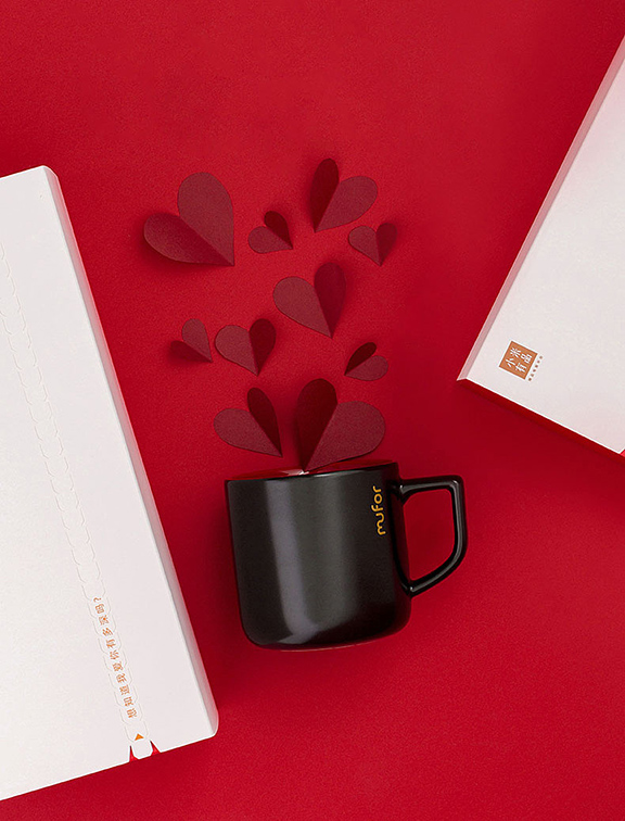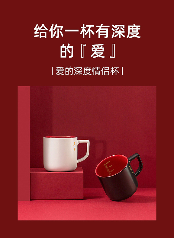 陶瓷杯设计说明:爱是积沙成塔,爱是日复一日,爱是互相吸引,每份爱都要经历遇见你、了解你、喜欢你、我爱你、我愿意的过程,当爱一点点变深后,感觉整个世界都翻新了。杯子外面是黑白色的情侣色,整体简约大方,杯内是红色的,代表了我对你的那颗炽热的心。杯内的刻度代表着我们走过的每一个阶段,每一个时刻都是我爱你。