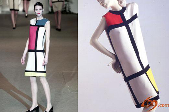 近年来,时装设计界也毫不收敛的刮起一阵艺术狂潮,时装设计大师伊夫·圣·洛朗在2002年的告别秀上沿用了蒙特里安的“红、黄、蓝”绘画,将“红、黄、蓝”的构成形式几乎原版不动的搬到他的时装设计当中,而如今,这位时装界的大师已经离开了我们。