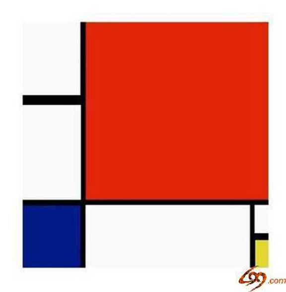 蒙特里安认为:以往的艺术都不具有永恒的价值,因为它们是对具体事物的描绘,或是对稍纵即逝的情感的表达。他却把几何学作为造型的基础,追求造型的普遍性,寻求一种体现永恒价值的艺术。因而蒙特里安的绘画是抽象的,因为他排斥一切写实的现象。蒙特里安认为红、黄、蓝三原色“是实际存在的仅有的颜色”,水平线和垂直线“使地球上所有的东西成形”。所以,在他的作品中就只有红、黄、蓝三种颜色和水平线、垂直线两种线条,而且这些元素被组织在某种理性控制的结构中,与某种客观的规律性结合。“红、黄、蓝”的绘画风格不仅体现了一种理性主义的完美思想,更被认为是影响后现代主义风格绘画思想的渊源之一。