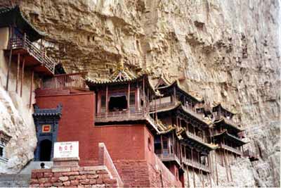 在中国众多的建筑中,悬空寺是非常奇妙的建筑。它处于深山峡谷的一个小盆地内,两边是1百多米高的垂直峭壁,悬空寺就像粘在一侧崖壁之上,悬于半空之中,距地面大约有50米。远远望去,层层叠叠的殿阁,只有十几根颤颤悠悠的细长木柱在下面支撑,而寺院上空往外突出的大片岩石,微微前倾,仿佛就要压下来一样,观者无不心惊胆战。悬空寺有大小殿宇台阁40间,楼阁间以栈道相连,游客踏上栈道,就会不约而同地提起脚跟,屏住呼吸,小心翼翼地踩在木板上,生怕一步踩重,寺就塌下去了。然而,尽管脚下“吱吱”作响,贴在岩石上的楼台却岿然不动。