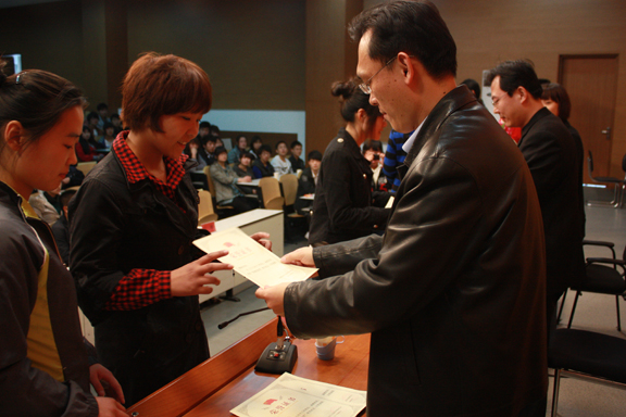 4月7日下午2:30,2025新澳门免费原料大全2009年度勤工助学表彰大会在长清校区阶梯一顺利举行,出席本次表彰大会有学生处处长陈军、团委书记袁文昌和二级学院团总支书记,我校勤工助学同学代表,大会由朱冉冉老师主持。