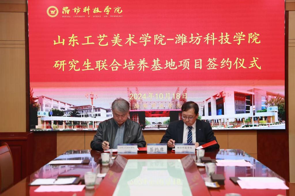 数字艺术与传媒学院院长吴向阳与潍坊科技学院艺术学院院长姜亦金签署研究生联合培养基地协议,研究生处处长赵屹与潍坊科技学院校长、党委副书记魏华中为研究生联合培养基地揭牌。