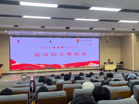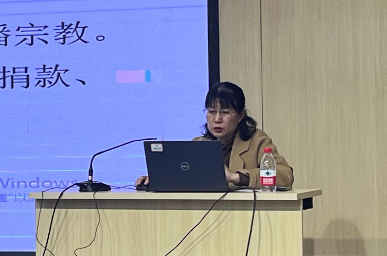 讲座第二部分,李蓉书记以“学习宗教政策,抵制非法传教”为题,向在场同学介绍了我国的宗教政策、非法宗教和邪教的界定以及危害。以真实案例劝诫同学们正确对待宗教问题,倡导新时代科学的学习生活方式,彰显新时代青年的活力与朝气。