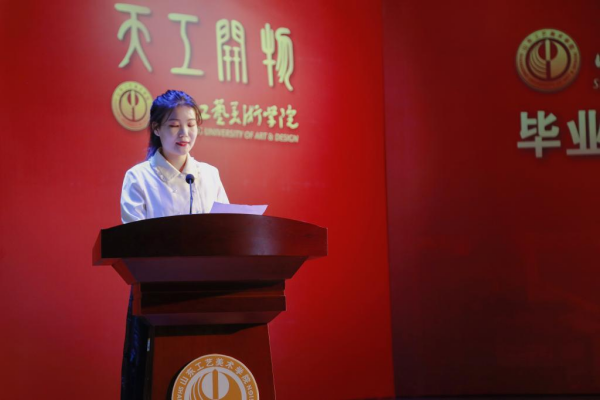 毕业生代表李明芳发言,她代表全体研究生向母校致以最衷心的感谢,她表示将时刻牢记“天工开物、匠心独运”的校训,秉承母校“为人民而设计”的理念,心系家国,以一颗永不倦怠的心去实现心中的理想抱负,用自己的青春描绘新时代美好蓝图中最绚丽的色彩!