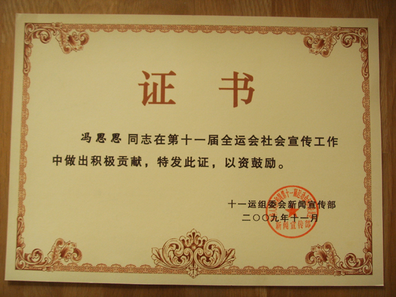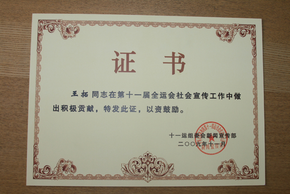 第十一届全运会组委会新闻宣传部充分肯定了我校研究生做出的积极工作,分别颁发证书予以鼓励。