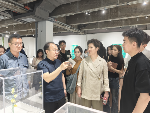 校领导在参观过程中与导师和研究生亲切交流,听取了同学们关于创作理念、材质技法和作品内涵等方面的介绍,现场体验了数字交互类作品,对展览整体情况表示肯定,同时也对进一步办好展览,提升展陈及评价方式,提出了具体建议。