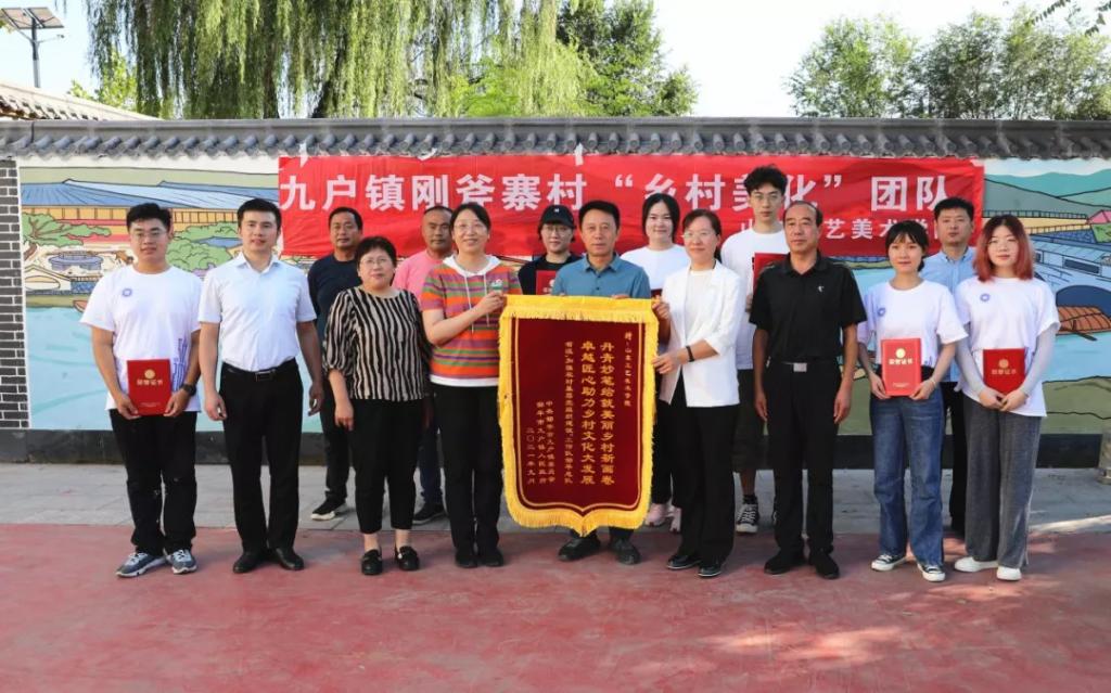活动最后,省派“加强农村基层党组织建设”工作队邹平市总队队长蒋文莉,九户镇党委书记孙美荣将“丹青妙笔绘就美丽乡村新画卷,卓越匠心助力乡村文化大发展”的锦旗授予帮扶团队,并向研究生志愿者颁发了个人荣誉证书。