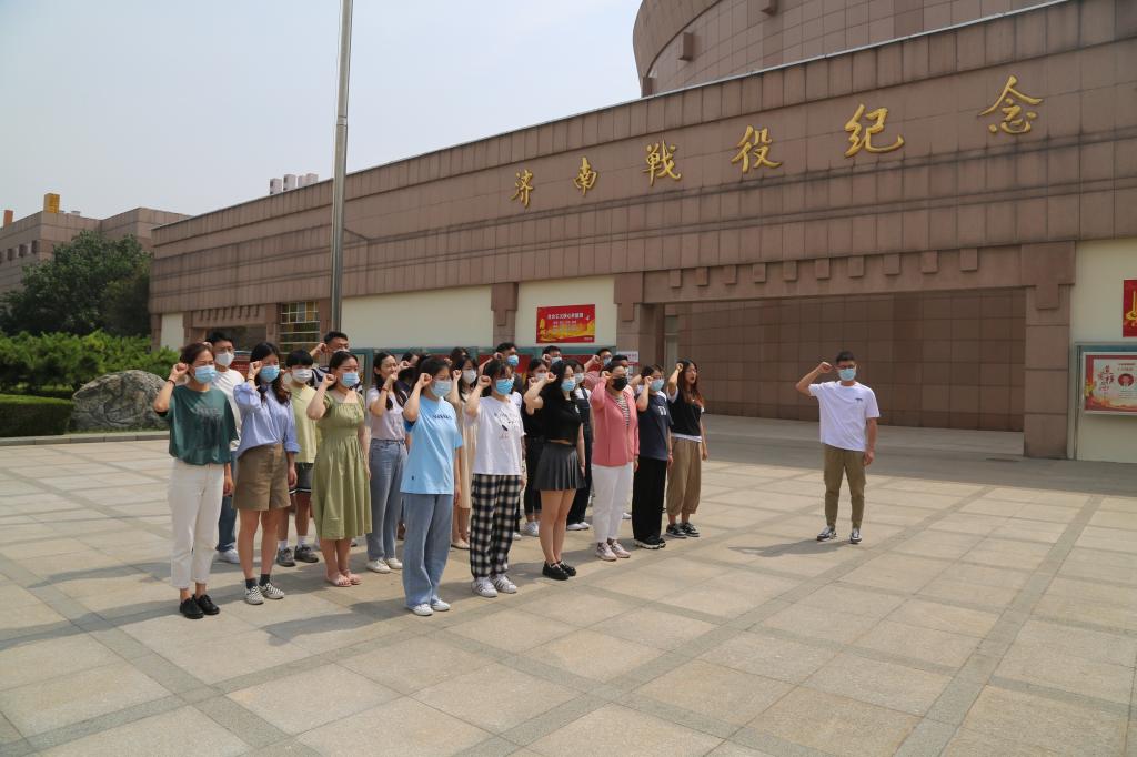 活动伊始,大家来到了位于英雄山的济南战役纪念馆,馆中陈列着济南战役时被鲜血染红的先烈们的棉衣和手稿,展示着战役时战士们使用过的武器装备。通过讲解员的引导和介绍,同志们不仅深入了解了济南战役的残酷过程,更对共产党人勇往直前、无畏牺牲的高贵品质有了感同身受的认知。参观结束,所有在场党员在程龙同学的带领下,面对党旗庄严的重温了入党誓词,在高昂的誓言声中,同学们进一步坚定了自己作为一名共产党人的理想信念。