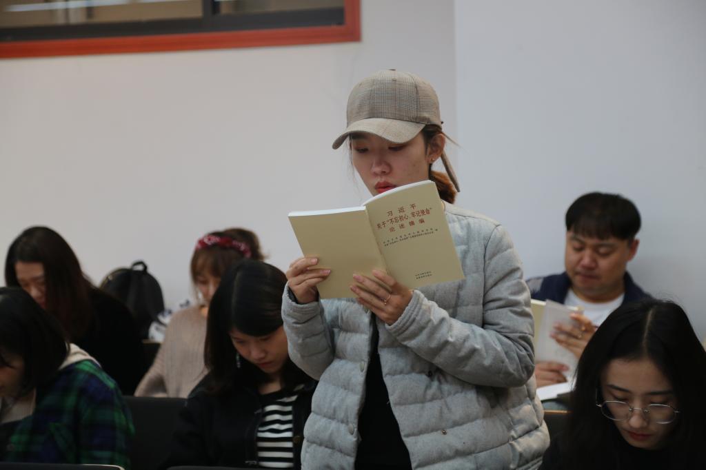 此次活动共分两部分进行。首先,在研究生党支部书记王卫卫老师的带领下,所有研究生党员共同学习了《习近平关于“不忘初心、牢记使命”论述摘编》,党员重温了“中国梦”、“中国共产党人的初心和使命”等多项重要内容。在领学之后,王老师就重点内容进行了提问,引起了同学们的思考,使得学生党员加深了对党的认识,增强了学习效果。