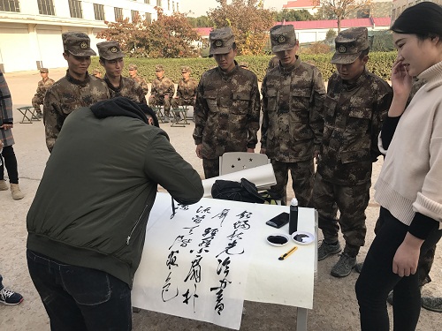 11月11日中午,我校研究生党员及积极分子在学校集合前往坦克基地。在此次活动中,我校书法及国画专业的研究生分别为战士们进行了现场才艺展示,获得了战士们的热烈掌声。紧接着,战士们在同学们的指导下进行了绘画和书法的练习,学习到了美术和书法的基本知识。最后,同学们参观了战士们整齐的内务、训练场地以及部队的坦克陈列馆,部队战士一一为大家讲解坦克陈列馆每一辆坦克的历史以及现在的服役状况,让同学们亲身感受到了部队的发展变化和保家卫国的实力。