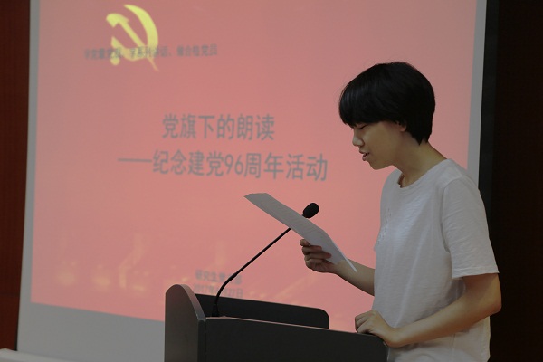 为庆祝建党96周年,同时扎实开展“两学一做”学习教育,营造浓郁的校园文化氛围,激发爱国爱党热情,坚定永远跟党走的政治信念,研究生党支部于6月27日在我校长清校区研究生学术活动室开展以“党旗下的朗读”为主题的庆祝建党96周年活动。全体研究生党员参加了本次活动。