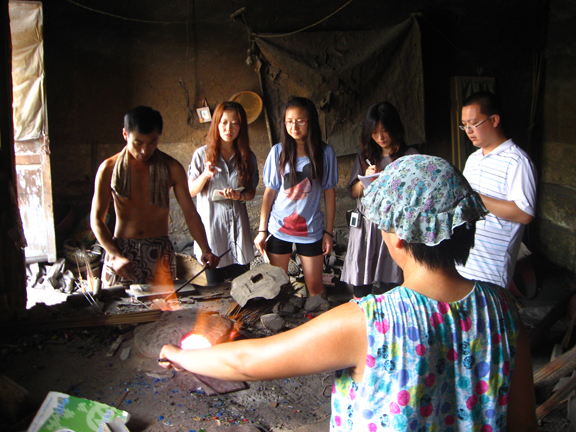 研究生询问艺人琉璃珠工艺