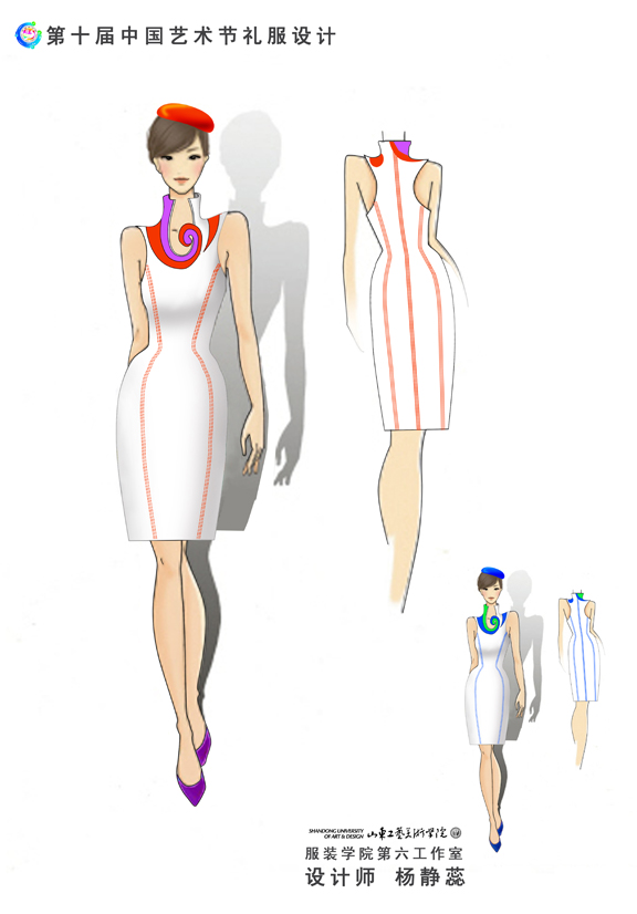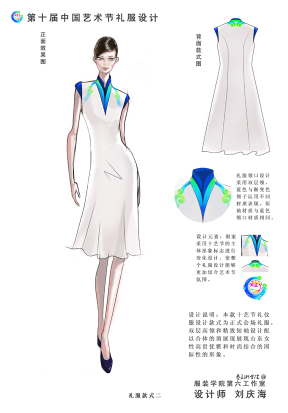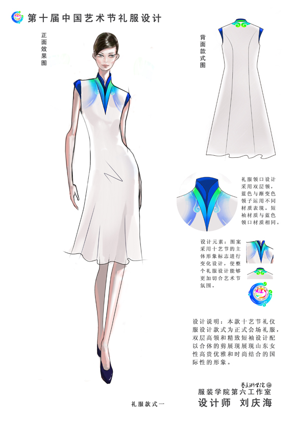 入选礼仪服装设计方案主题寓意十全十美,和和美美。既体现当地民俗特点,又具有现代外观造型,是内涵和外观的完美结合。充分展示了我校服装设计团队的水平,得到了“十艺节”筹委会领导和社会的广泛赞誉。至此,我校圆满完成了“十艺节”礼仪服装设计任务,为“十艺节”筹备工作作出了贡献。