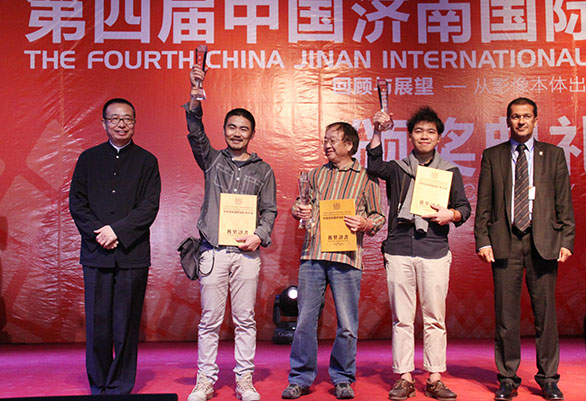 UPI国际摄影家联盟主席马诺里斯和山东省文联主席、我校院长潘鲁生为最高学院奖获奖者李百军、王轶庶、黄京颁奖