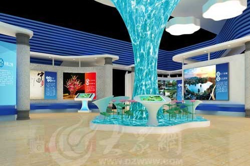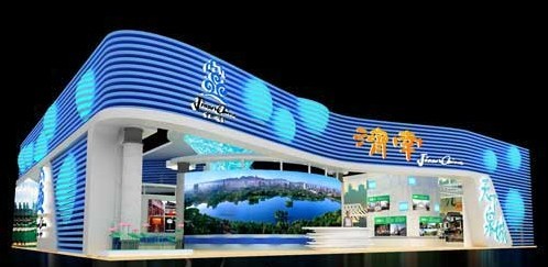 济南展区面积为500平方米,是十七地市面积最大的展区,以“文化济南天下泉城”为主题,设计理念围绕“水”、“城”二字做文章,泉城最有特点的元素就是“泉”与“水”,同时她又是一座有着2600年历史的古城,济南历史底蕴深厚,“天下第一泉”世人皆知,七十二名泉遍布泉城,泉水已成为济南的灵魂,我们通过各种设计元素,用多元的展示手段来体现古老泉城的新文化概念。蓝色为主色调,在视觉上表达“水”的概念。展区为四方形,其中有一面墙为整个济南市的城市剪影,四周围绕水的造型,这些水既是泉水,又象征着护城河,主造型体现“水环绕的城市”的设计理念。