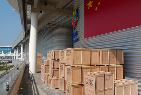 7月2日,展览展示在我校试搭建完成,省政府副秘书长张忠明受省领导委托,率省商务厅、外办、世博办等单位领导现场观摩指导。张忠明副秘书长一行指出,展览展示组根据省领导意见和有关部门建议,潜心研究,精心设计,较好贯彻了省指示精神,相关工作受到省领导肯定。7月27日,我校工业设计学院副院长韩文涛、副教授林宇峰和实践教学中心教师单大鹏等带领11名施工人员先期抵达世博园区,接收经过20天跨海运输的40箱货物,并按计划展开技术对接、施工准备以及正式搭建工作。