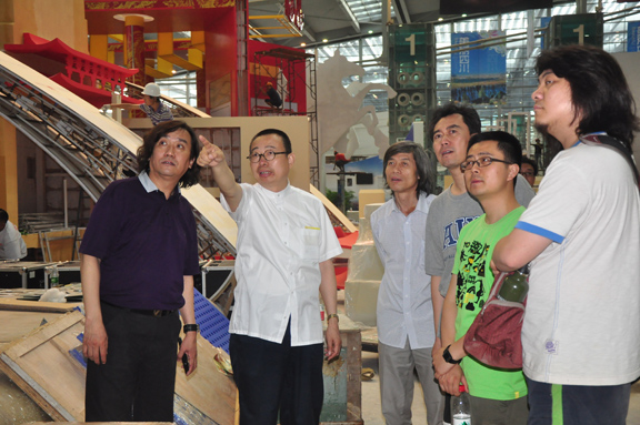山东展区项目总负责人、我校社会服务办公室主任孙磊,总协调、我校工业设计学院副院长韩文涛,工程施工组组长张震、副组长毕剑翎,运营管理组副组长王延羽,运营管理组林宇峰,影视演艺组组长吴向阳以及我校项目团队工作人员视察时在场。