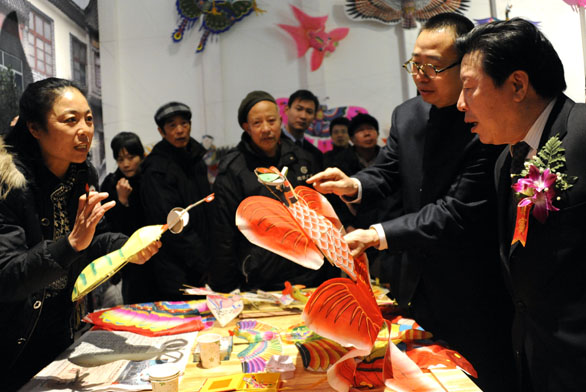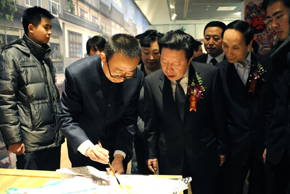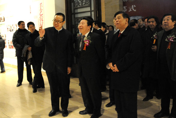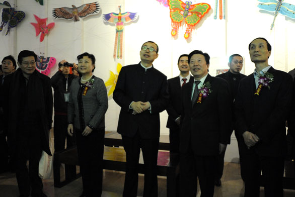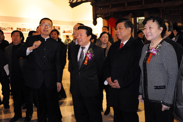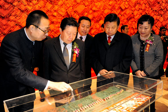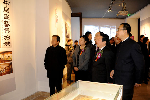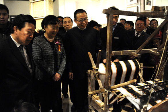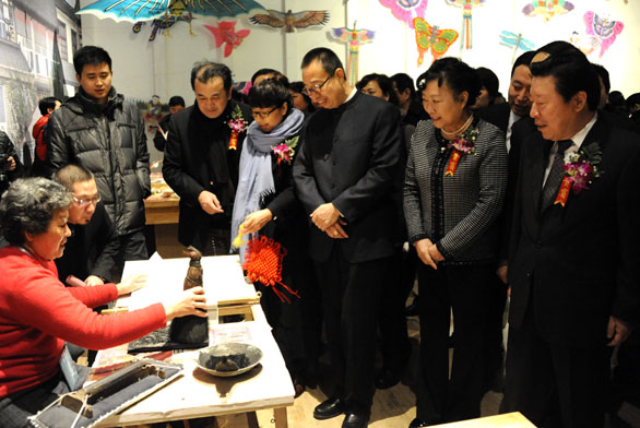 1月9日上午,《手艺农村――潘鲁生主持山东农村文化产业调研成果展》在北京中国美术馆开幕。 开幕式后,全国政协副主席、中国文联主席孙家正,中国文联党组书记、常务副主席胡振民,中宣部副部长翟卫华,文化部副部长赵少华,中国文联党组成员、副主席冯远,中国文联副主席、中国民间文艺家协会主席冯骥才,中国文联副主席 中国美术家协会主席刘大为,中共山东省委常委、宣传部长孙守刚,中宣部文艺局局长左中一,中宣部干部局局长蒲增繁,全国人大教科文委员会文化室主任朱兵,文化部非物质文化遗产司司长马文辉,中央美术学院院长潘公凯,中国美术家协会分党组书记、副主席吴长江,中国书法家协会分党组书记、驻会副主席赵长青,中国艺术研究院党委书记张庆善,中国美术馆副馆长谢小凡,全国宣传文化系统“四个一批”人才代表、八一电影制片厂副厂长黄宏,全国宣传文化系统“四个一批”人才代表 、著名歌唱家殷秀梅,国际著名策展人、意大利文化中心主任维琴佐•桑弗,山东省文联党组书记于钦彦等中央和省级领导与首都各界艺术爱好者一起参观了展览。 孙家正等领导表示,《手艺农村――潘鲁生主持山东农村文化产业调研成果展》展览内容丰富,资料翔实,形式生动,以文献及实物展示、手艺人演示、手艺创意等形式,全面展示了山东农村文化产业发展成果。此次,农民手艺步入国家艺术展堂,表现的是农村文化产业多元的产业模式。展览从侧面反映出,通过实施产业带动战略,推动“企业带基地,基地连农户,农工贸结合”,促进手艺产业成为农村区域化的支柱产业,实现农村经济、文化、生态、社会协调发展,将进一步激发农村手艺文化产业的意义和价值。展览以全新的形态表现了农村手工艺在创新生活方式、拓展产业空间、带动农民致富、促进经济增长方式转变等方面发挥的积极意义。