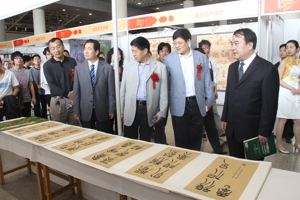 5月2日上午,我校2010年设计艺术博览会暨2010届毕业生推介会在济南舜耕国际会展中心隆重开幕。开幕式结束后,中共山东省委宣传部副巡视员王世农,山东电视台总编辑祝丽华,省人力资源和社会保障厅技术人才处处长张敬荣,省经济和信息化委员会科技处处长孟繁华,省教育厅学位管理与研究生处处长薛立魁,莱芜市副市长刘杰,菏泽市政府副秘书长蔡文厚,山东经济学院副院长崔友平,山东省电影学校副书记郭福苓,济南市长清区知识产权局局长樊敏,齐鲁动漫基地董事长台文倩,我校党委书记于茂阳,党委副书记杨新力,副院长李新、刁在祥、张云龙、苗登宇等领导参观了展览。 领导们在参观过程中纷纷对我校毕业生的作品表示赞赏,认为我校毕业生设计作品创意独特、设计新颖、做工精细,将设计与生活紧密联系在一起,具有很强的实用性,真正起到了引领生活的作用。领导们还表示,本届设计艺术博览会暨毕业生推介会搭建了一个就业与创业的平台,为参展同学和用人单位提供了更多直面的交流机会,为推进毕业生就业创业发挥了积极的作用。