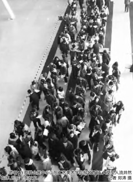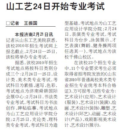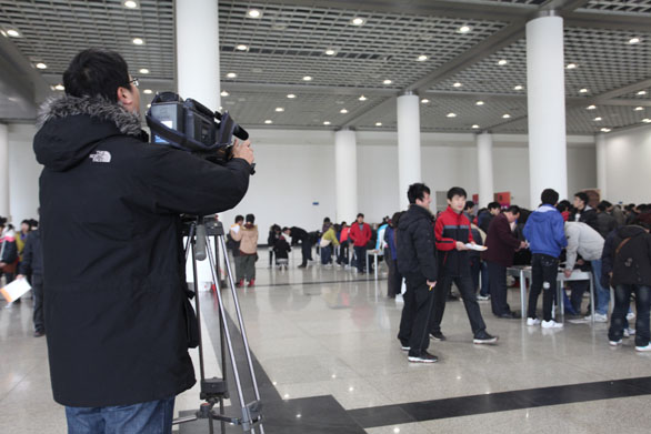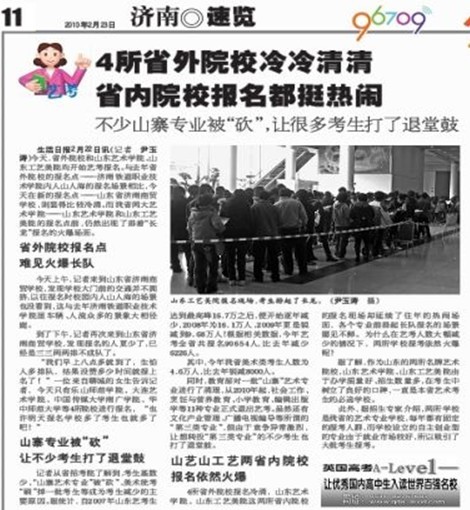 2月22、23日,我校2010年专业招生考试现场报名工作在舜耕国际会展中心顺利进行。我校专业招生工作得到了社会各界的广泛关注,社会媒体纷纷予以采访报道,各大网站也相继转载报道。 新华社山东分社、山东电视台、山东教育电视台、齐鲁晚报、山东商报、生活日报、济南日报、济南时报、都市女报、齐鲁周刊等媒体对我校招生报名工作进行了现场采访。22日山东卫视《山东新闻联播》、山东教育电视台《教育新闻》以及《齐鲁晚报》等媒体对我校专业招生考试报名首日的情况进行了报道。 各媒体记者深入到报名工作各个环节, 对部分家长、考生、带队老师进行了现场采访,并就相关问题采访了我校相关负责人、工作人员,了解了此次招生报名工作的具体情况。 报名现场秩序井然、志愿者服务热情、工作人员严谨负责,给媒体记者留下了深刻印象。各媒体记者对我校此次招生考试现场报名工作给予了很高的评价。