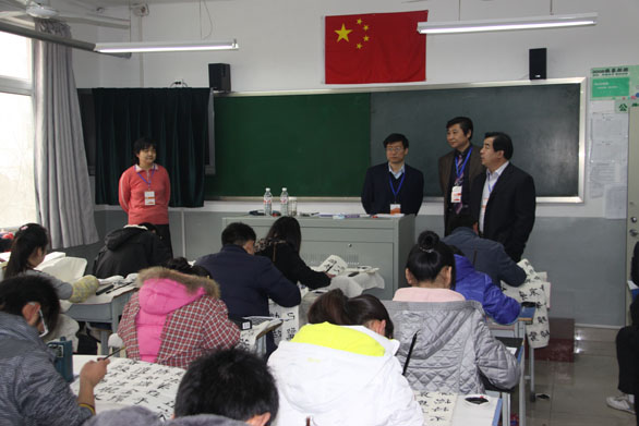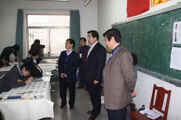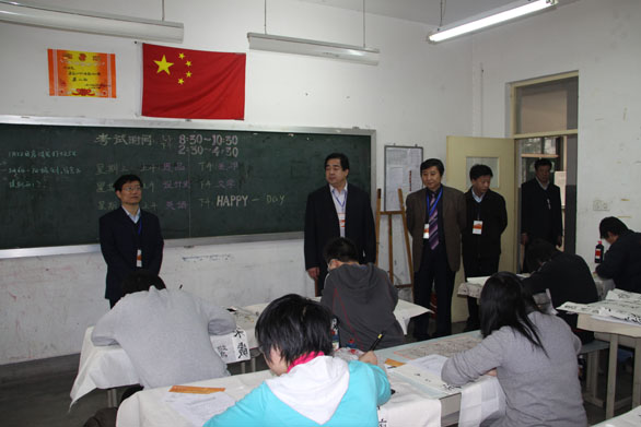 2月24日上午,我校2010年招生专业考试拉开帷幕,部分考生在应用设计学院分院考点参加考试。上午10:00,副院长张云龙,院长助理、办公室主任王立果来到应用设计学院分院考点巡视,检查指导考试工作。省电影学校党委书记、校长安立元陪同巡视。 副院长张云龙,院长助理、办公室主任王立果仔细巡视各个考场,查阅考生试卷,询问考试有关事宜,指导考试工作。校领导充分肯定了井然有序的考场秩序,要求监考人员要本着对考生负责的态度,严肃考场纪律,严格考试程序,确保考试的公平、公正。 应用设计学院分院考点领导对我校的专业招生考试工作高度重视,成立专门机构,承担了考试具体工作。学校领导对省电影学校在我校招生专业考试工作方面给予的支持和付出的努力表示感谢。 考务组组长康健,考务组副组长滕丕强等陪同巡视。