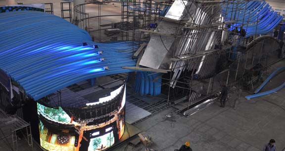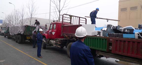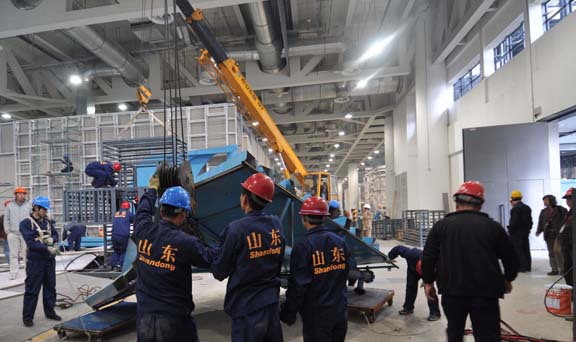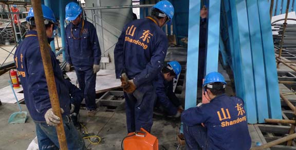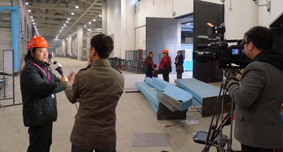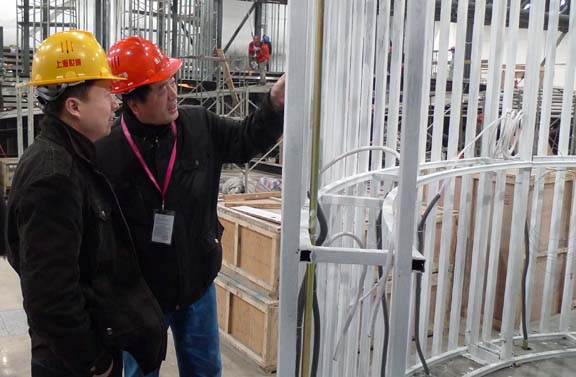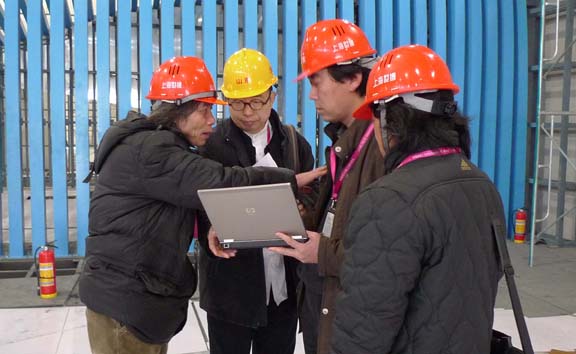 在济南成功搭建的基础上,春节前山东馆进入了上海施工搭建新阶段。工作人员和各方面建设者不辜负山东人民与省领导的重托,全力以赴,按照高质量、高水平、高标准要求,文明、安全、高效地进行施工。 2月5日,项目部副总指挥毕剑翎率领王启健、王延羽、张震、李海涛、韩英杰、王瑞奇共七人先期进驻世博园区,展开工作。随着两批货物进场,中通地台与天图综合布线首先开启了山东馆的建设序幕。腊月29日晚11时,人员返济。大年初三,春寒料峭,毕剑翎、张震、李海涛、韩英杰、王瑞奇,作为世博园区最早的工作人员再次返沪;