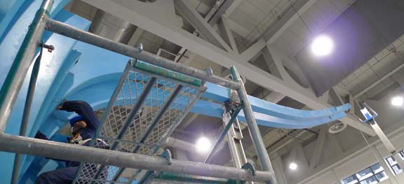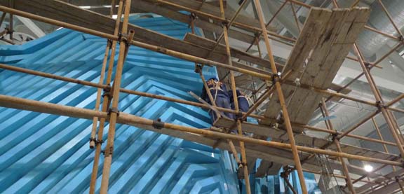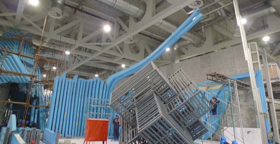 目前,按照时间节点与计划,山东馆建设进展顺利,2月18日完成了山东馆地台的全部搭建;21日完成了尾厅基本框架搭建;25日完成了山东馆山体部分搭建;27日完成了鲁班锁安装,展项、显示与照明设备进入场地;28日完成了序厅部分主体安装,得到了省领导以及世博局领导的一致好评。