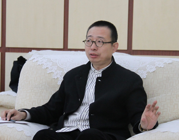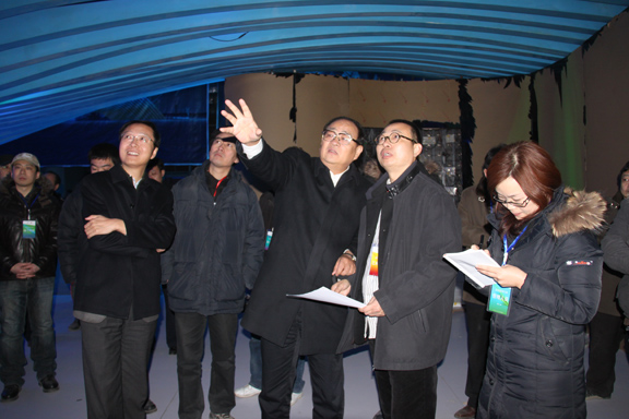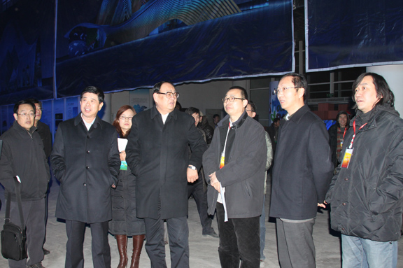 我校世博会山东馆项目部副总指挥郭去尘、韩文涛,文案与展品展项组组长孙磊、设计组组长王延羽、工程组组长张震、影视组组长韩青等项目负责人员也陪同视察。