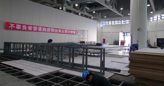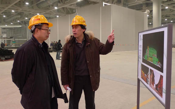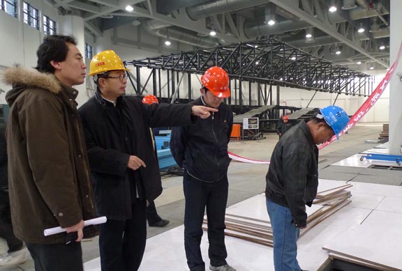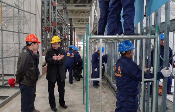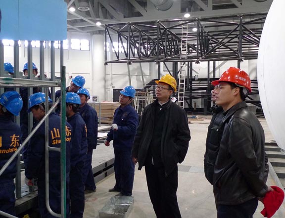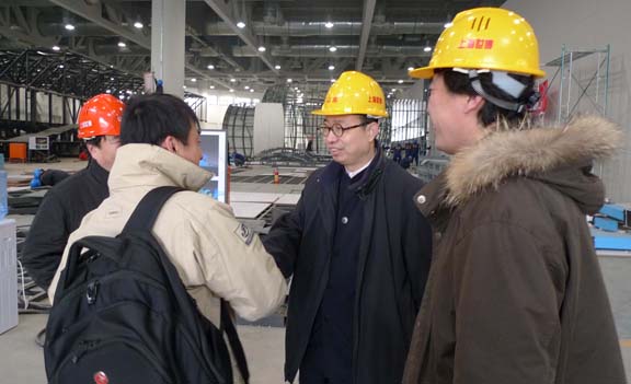 院长首先视察了山东馆的施工情况,并对中通、威迪、天图、众城等公司的施工与监理人员在春节期间坚持工作,表示感谢。同时希望各个单位要在济南成功搭建的基础上,再接再励,高标准、高水平,按照既定时间节点胜利完成世博会山东馆的正式搭建,不辜负省委省政府和山东人民的期望。