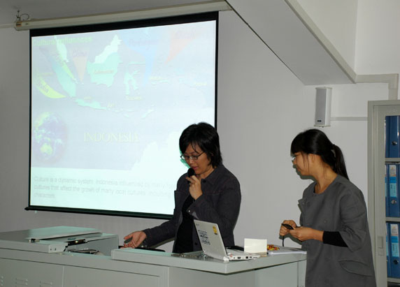 随后,Riama Maslan Sihombing女士为同学们讲解了印尼传统首饰的背景文化。为了帮助同学们了解印尼文化,Riama Maslan Sihombing女士从地理、历史两个方面简要的介绍了印尼,并依托印尼各岛不同的婚礼形式,阐述了印尼首饰所承载的内涵。Riama Maslan Sihombing女士认为,印尼的首饰不仅有美丽的外形,也蕴含着许多传统的宗教思想,更是人们身份和地位的象征。印尼的首饰风格也受到许多不同国家文化的影响,随着各国交流的不断密切,印尼传统文化力求与现代文化结合,并竭力将其运用到市场中去。为此,Riama Maslan Sihombing女士为同学们展示了部分印尼首饰设计比赛的作品,让同学们看到了印尼首饰的变化与发展,及传统文化在现代文化中的继承与发扬。
