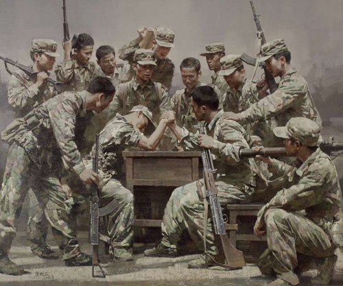 有一幅名字叫《较量》,表现的是军人在扳手腕,感觉很有气势,以前在我心目中军人都是很严肃的,但是这幅作品却表现了他们很生活的一个场景,感觉和原来不一样。