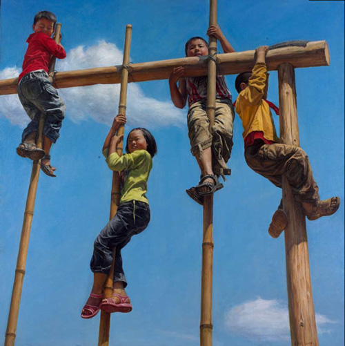 印象最深刻的是有一幅很大的,名字是《青铜时代把酒论英雄》,里面有很多的名人,很有意思;还有一幅《攀》,四个小朋友互相玩逗,表情都非常生动,我觉得让人看了之后有一种感染力,想让人驻足多看一段时间;再就是因为我本身的专业是品牌设计,属于平面设计,就特意看了一些版画的作品,感觉也是非常精美,能看出作者在创作过程中融进了很多努力。