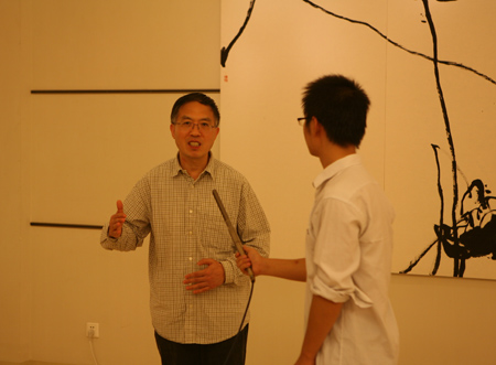 有很少艺术家像潘公凯老师这么清楚,他自己所面临的问题,这么清楚他自己所面临的这个创作环境,这么清楚他自己身后的西方艺术冲击的背景。在这种情况下,他自己觉得他就像是一个孤独的行者,把自己的抱负,自己的使命感,以及把艺术传统的命脉想扛在自己身上的这么一个孤独而行的独行者。他在现代这种创作的情境下,在坚持把自己对于笔墨的理解跟传统连接起来,跟现代这种社会状况,跟人们这种的审美吻合起来,来创作这么一批大画。我觉得这是他艺术创作一个非常重要的意义。我们可以说站在潘公凯这个大画面前,一方面我们感受到了我们欣赏当代艺术的这种强烈的视觉冲击,这种震动,因为它规模很大,尺幅很大,我们一进到这个展厅,一种强烈的水墨韵味,一下子就把你的眼睛盯牢了。另一方面,我们细细品味的话,我们知道它跟传统有一种关系,比方说他跟吴昌硕的关系,跟八大的关系。我们从笔墨上也好,从他画的主题也好,特别是从他的格调,他所给人展示出来的大气磅礴的这种感觉,或者我们用老子的话说就是大象不形,甚至有时我们辨别不出这个形象已经飘到哪儿去了,但是水墨的这种韵味,水墨的这种流动感,这种随着我们脚步移动,在我们视觉上产生的不断变换的这种感觉,这些东西还都是可以强烈的印在我们印象当中。
