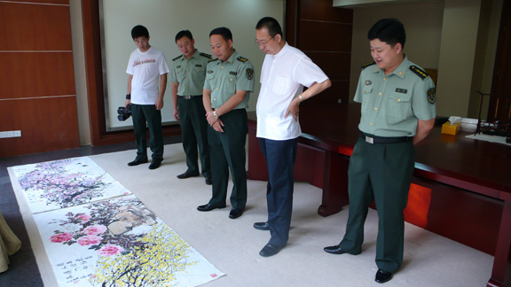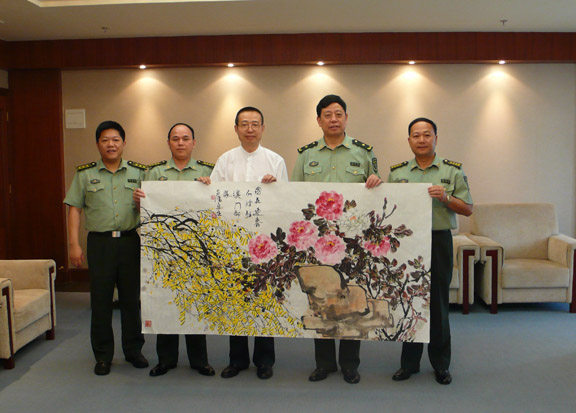 院长将画作题字“国花迎春”,以牡丹迎春象征澳门回归祖国大家庭,并向人民解放军驻澳门部队赠送了我校师生作品集,丰富驻澳战士的业余生活。