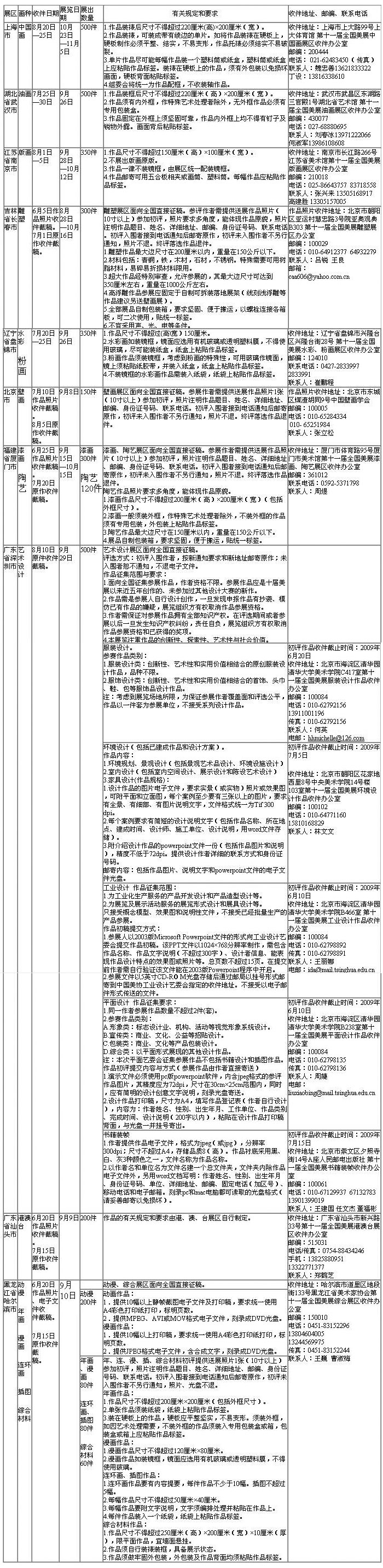 注:1.送选作品尺寸应按规定办理。考虑到有些作品已完成,但尺寸超过了规定,为使这些作品不失去送选的机会,因此,凡超过规定尺寸的作品,作者应在2009年4月底前将作品照片及说明(作品内容介绍、作品尺寸、创作日期等)寄往第十一届全国美展办公室,征得同意后,方可送作者所在地区进行评选。 2.组画作品以一件计算,尺寸的总和按一件作品的尺寸规定。 3.面向全国直接征稿的画种,各地美协也要广泛发动,认真组织创作,并协助作者完成各展区送件工作。 4.第十一届全国美展办公室地址:北京市朝阳区农展馆南里10号第十一届全国美展办公室 邮编:100125 电话:010-65389021 网址:。