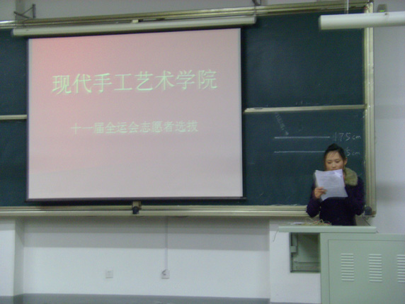 伴随着第十一届全运会脚步的逐渐走近,全运会大学生志愿者招募活动也拉开帷幕。“和谐中华、活力山东”的呼声点燃了我院学生的激情;青春、热情、自信,激励他们秀出自我、服务全运。2009年2月28日下午六点,现代手工艺术学院在我校长清校区七合堂进行了第十一届全运会志愿者第一轮选拨活动。