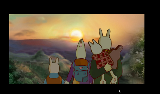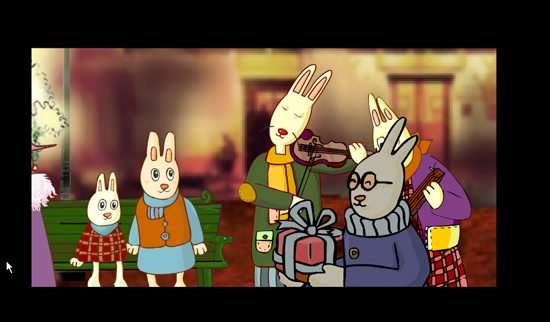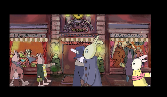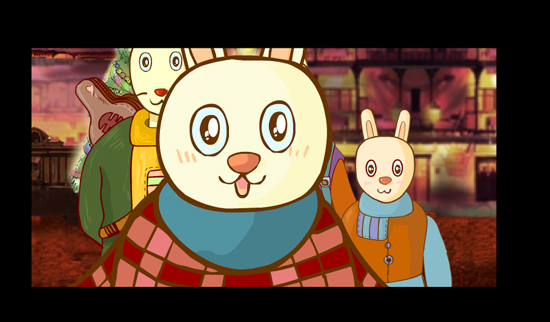 王:作品内容是这样的:在欢乐的圣诞夜,商店里摆放着琳琅满目的商品,人们都在为节日忙碌着。兔子一家四口流浪在街头,琴师用心的演奏着,小兔子则被售货车上的一块糖所吸引.而一块糖对这一家人来说是奢侈的,他们用身上仅有的一枚硬币换来了那块糖作为圣诞的礼物.这块糖被分为四块,幸福在他们心中传递。幸福来自家人爱的分享,来自心中充满的希望。