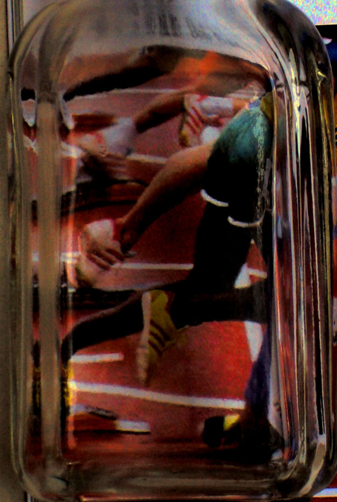 困难肯定会有啊,像光线、空间、瓶子的摆放、透视等等。这些都要从不同的角度去尝试、去发现,而且这些运动的图片不是拿来就可以用的,要翻阅很多的资料。还有就是技术问题,技术是为艺术服务的,技术不到位也创作不出好的作品。这项作品我不满意的地方就是我用的这些照片都来自杂志,我觉如果是出于我自己的创作,就能把思想展现得更生动。