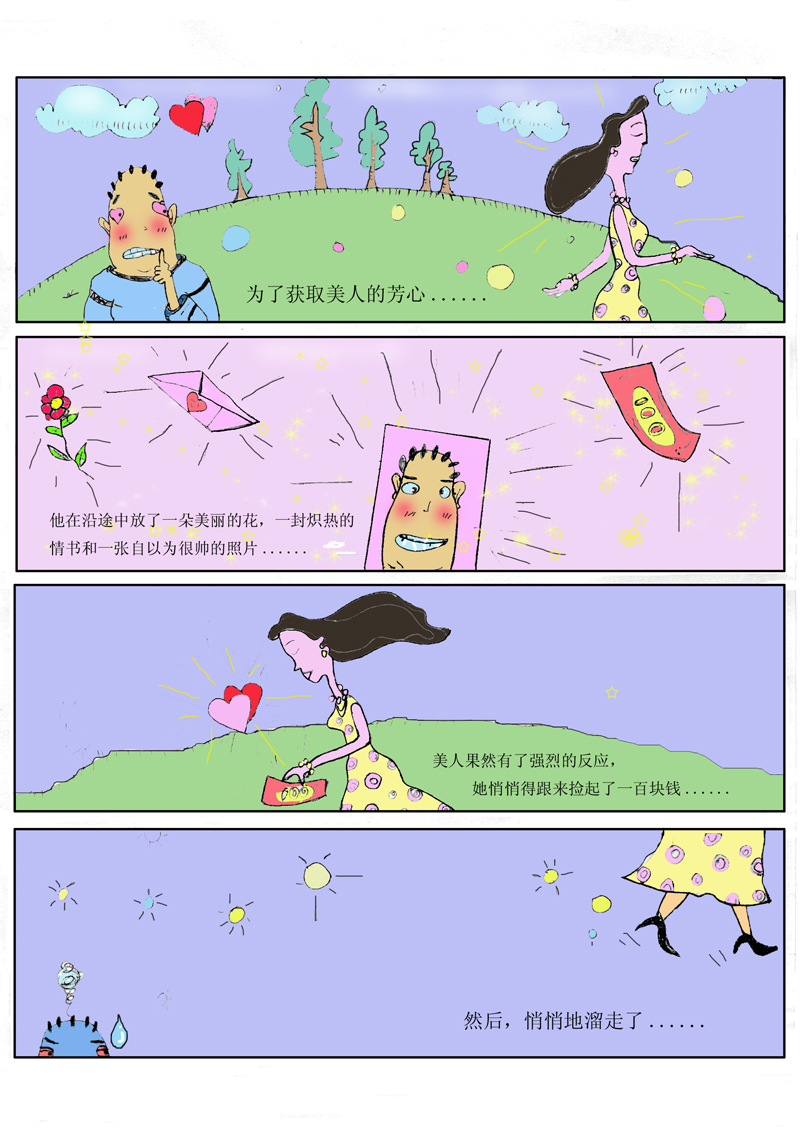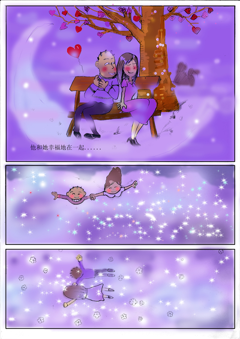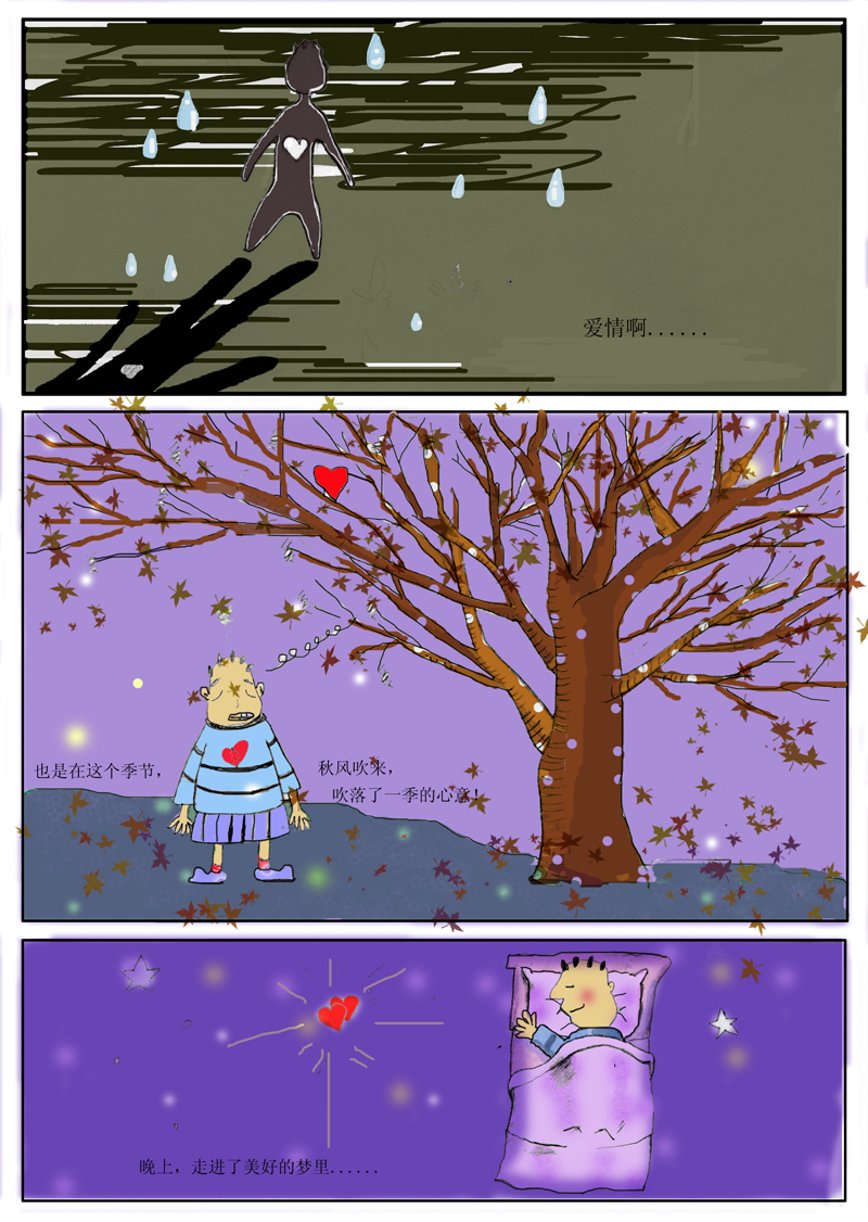 殷:主要表达“爱情来的快,结束的也快”。虽然我没有经历过爱情,平时只是看漫画、小说等所感受的。我认为若是两个人在一起,就应该相互了解,相互信任,不能欺骗对方。在创作的时候,时间有点仓促,思考得也不是很完善,但在创作过程中不断丰富内容,不断充实想法,最后就是现在看到的作品了。