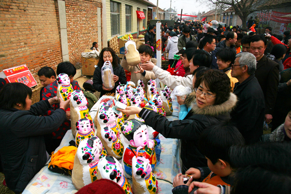 2008年3月9日上午,在结束对高密扑灰年画、聂家庄泥玩具的田野考察后,课题组一行九人来到滨州市,考察在这里举行的二月二娃娃庙会,感受民间传统节日的热闹气氛。